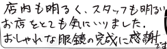 「店内も明るくスタッフも明るい。お店をとても気に入りました。おしゃれな眼鏡の完成に感謝です。」 K様